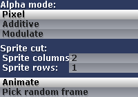 - Animate: animate sprite frames through the particle's life time from frame 0 to rows * columns.