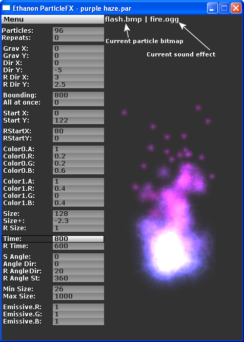 Particle effect editor generates *.par files that may be loaded by the Entity Editor to attach particle systems to entities.