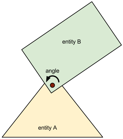 A revolute joint forces two bodies to share a common anchor point. The revolute joint has a single degree of freedom: the relative rotation of the two bodies. This is called the joint angle. To specify a revolute you need to provide another entity and the relative position for the two anchor points, for A and B (also called the other entity).